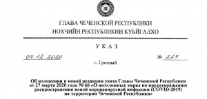 09.12.2020Об изложении в новой редакции указа Главы Чеченской Республикиот 27 марта 2020 года № 66 «О неотложных мерах по предотвращениюраспространения новой коронавирусной инфекции (COVID-2019)на территории Чеченской Республики» ссылка